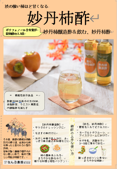 「妙丹柿酢」と「くだもの酢 妙丹柿酢」(柿酢飲料)の2タイプの製品を発売。
