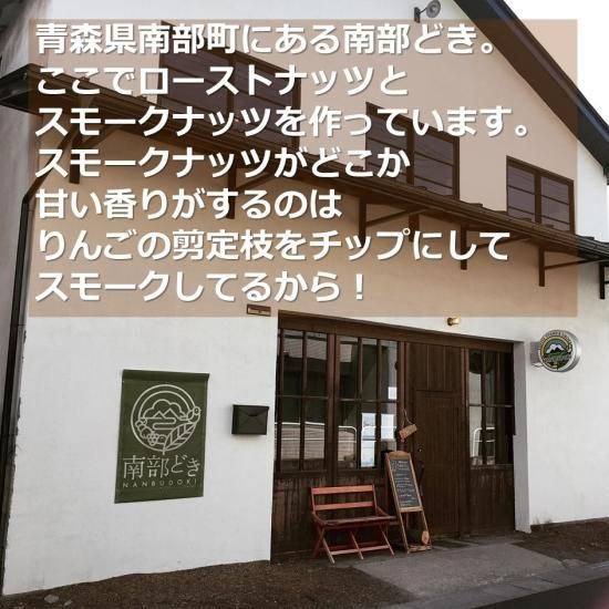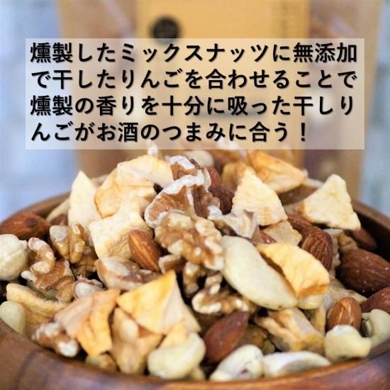 生のナッツ(クルミ、カシューナッツ、アーモンドの3種)を果実の剪定枝(フルーツのウッドチップ)で燻製(スモーク)し、乾燥青森りんごとミックスしました。